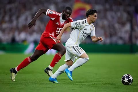 دخل الفريق البافاري بقوة وفرض أسلوبه على مجريات الشوط الأول ،حيث ضغط عاليا في مناطق ريال مدريد الذي إكتفى بالدفاع و بمرتدات عقيمة من ثنائي الهجوم مبابي و فينيسيوس.وفي الدقيقة 41 كسر لويس دياز نتيجة التعادل كما كسر خط دفاع المرينغي بعد تمريرة سحرية من قدم جنابري أودعها الأول في شباك الحارس لونين .